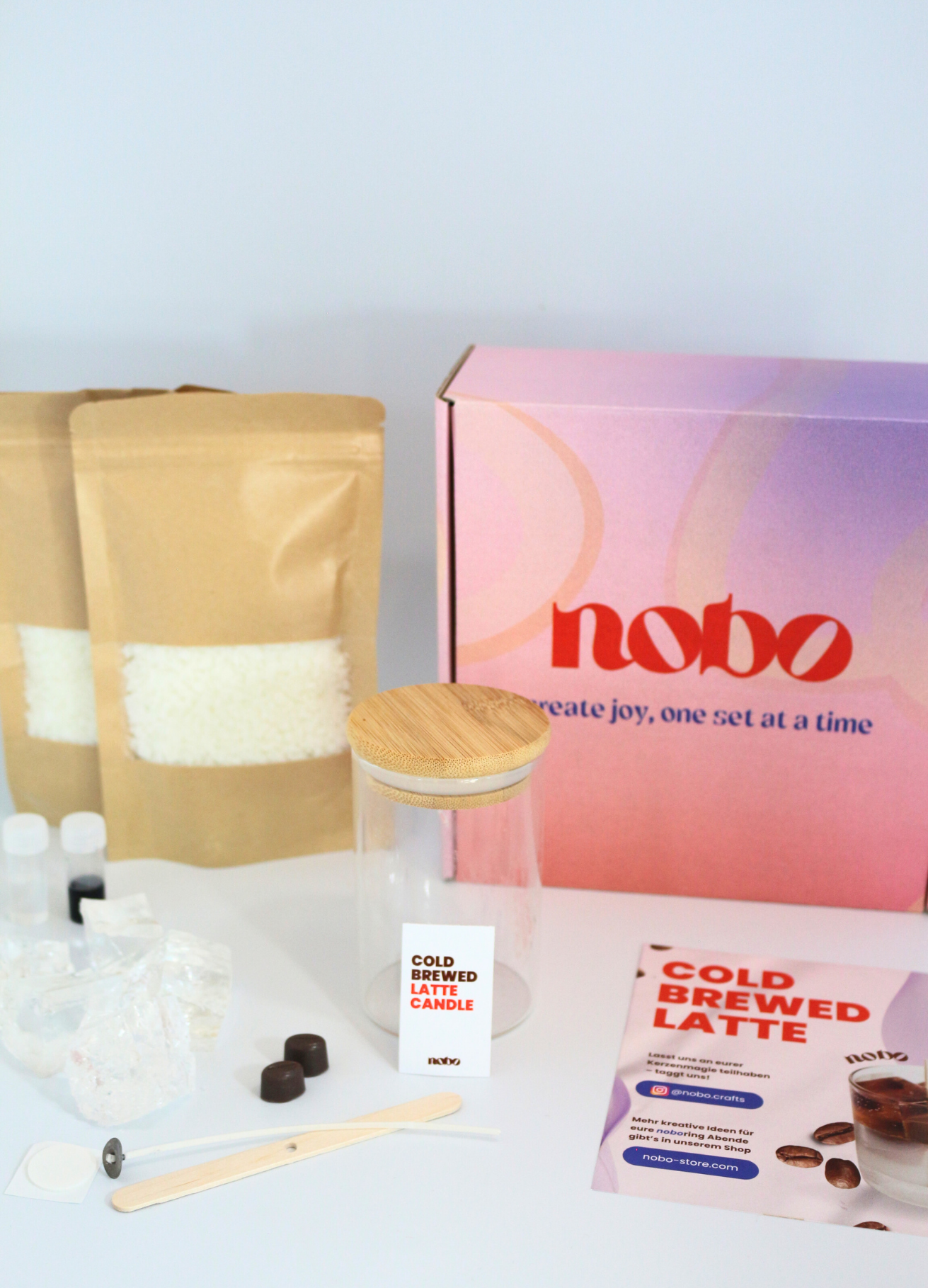 Mit dem nobo Cold Brew Candle Kit erhältst du ein komplettes Set, um eine Kerze zu gestalten, die aussieht wie dein Lieblings-Iced Coffee.